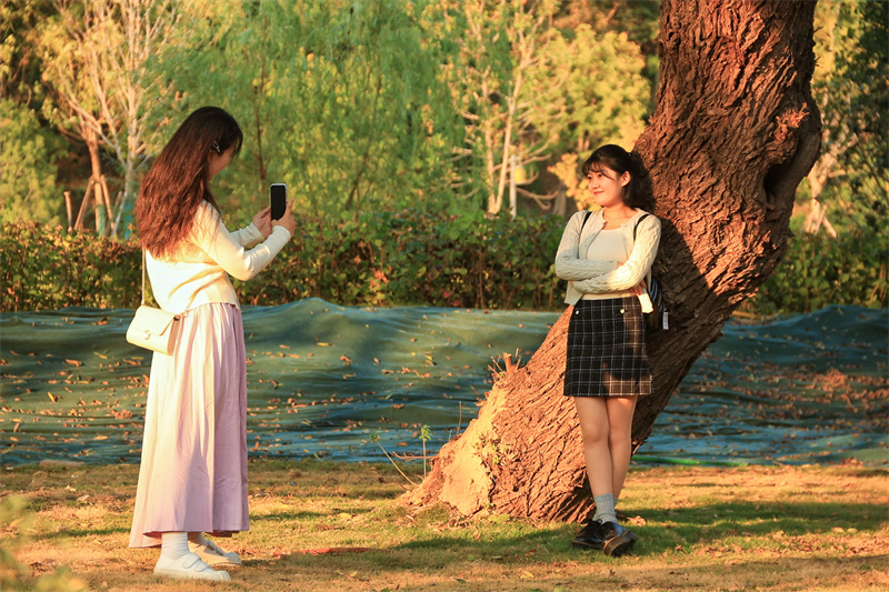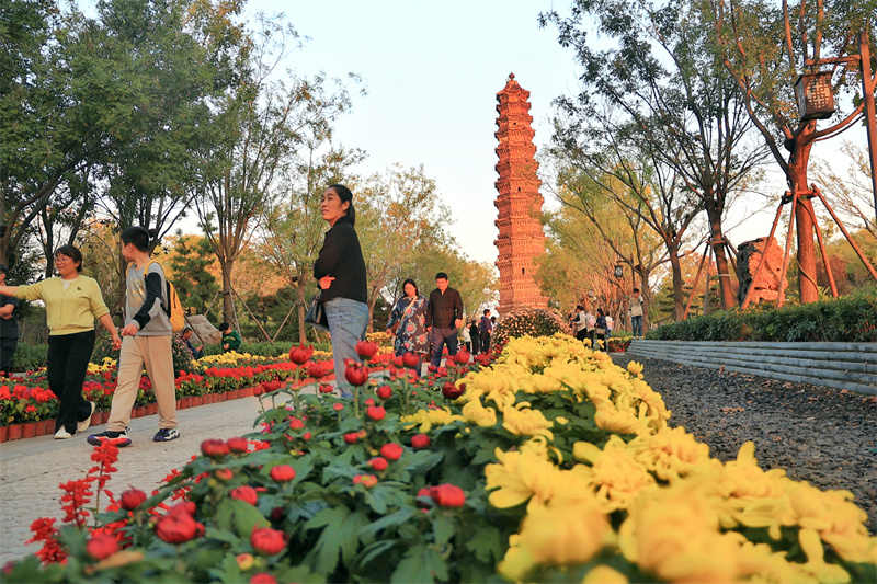 10月29日,在暖陽的映襯下,鐵塔公園景色優(yōu)美,游客在這里游玩賞菊,很是愜意。開封+記者 李浩 攝