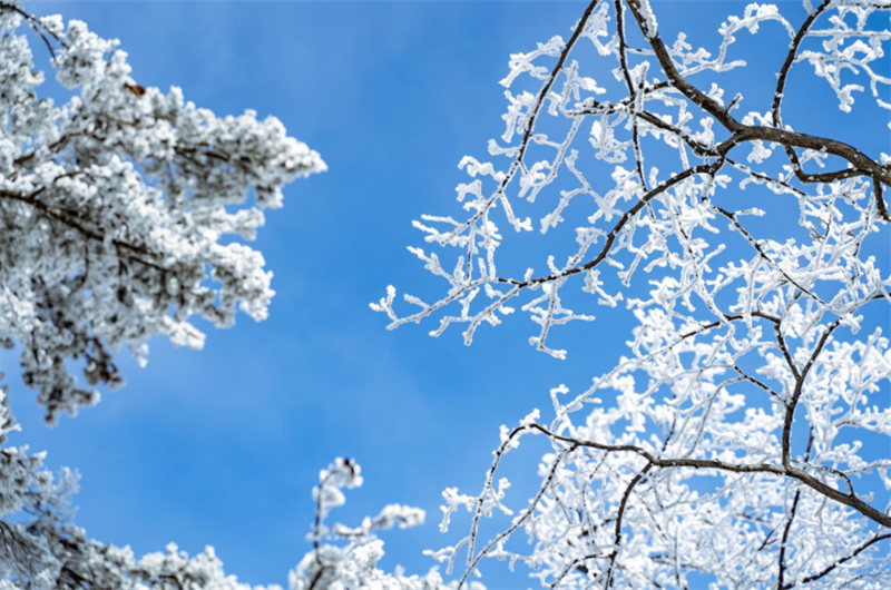 待天氣放晴之后,澄澈天空與雪色霧凇更形成難得美景。