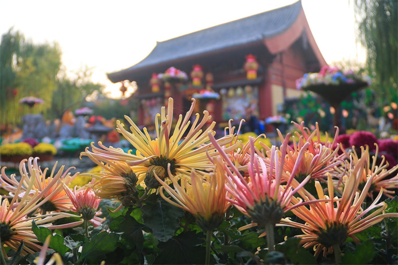 近日,開封氣溫適宜,天氣晴朗,菊花依然爭奇斗艷,花開正濃,吸引著眾多游客前來古城游玩賞菊。開封+記者 李浩 11月20日 攝