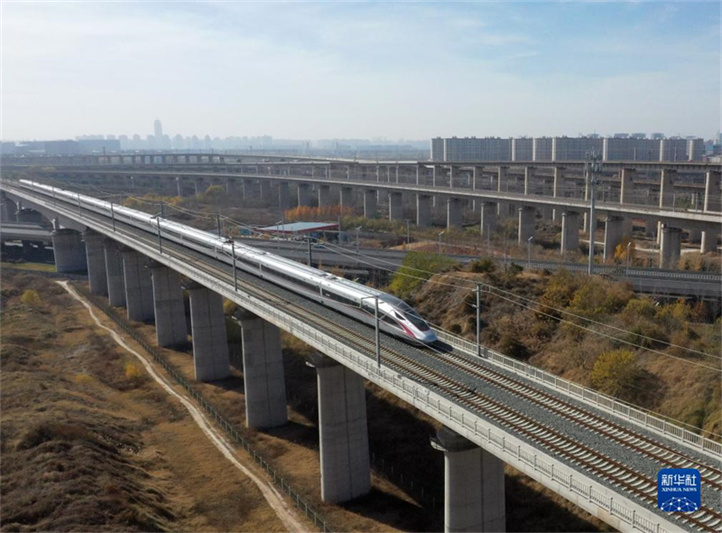 12月8日,在鄭州市東三環(huán)附近,列車(chē)行駛在濟(jì)鄭高速鐵路上(無(wú)人機(jī)照片)。12月8日,濟(jì)鄭高鐵全線貫通運(yùn)營(yíng)。濟(jì)鄭高鐵是國(guó)家“八縱八橫”高鐵網(wǎng)的重要連接線,是山東省“八縱六橫”高鐵網(wǎng)的西向出省通道,也是河南“米”字形高鐵網(wǎng)的最后一“筆”。項(xiàng)目通車(chē)后,魯豫兩省實(shí)現(xiàn)高鐵直通,鄭州東站至濟(jì)南西站間最快1小時(shí)43分鐘可達(dá)。新華社記者 李嘉南 攝