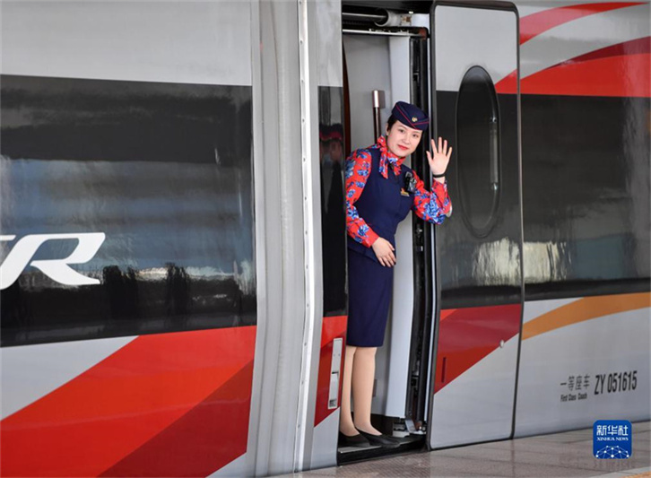12月8日,濟(jì)鄭高鐵鄭州東站首發(fā)G4830次列車(chē)乘務(wù)員向旅客揮手致意。12月8日,濟(jì)鄭高鐵全線貫通運(yùn)營(yíng)。濟(jì)鄭高鐵是國(guó)家“八縱八橫”高鐵網(wǎng)的重要連接線,是山東省“八縱六橫”高鐵網(wǎng)的西向出省通道,也是河南“米”字形高鐵網(wǎng)的最后一“筆”。項(xiàng)目通車(chē)后,魯豫兩省實(shí)現(xiàn)高鐵直通,鄭州東站至濟(jì)南西站間最快1小時(shí)43分鐘可達(dá)。新華社記者 李嘉南 攝