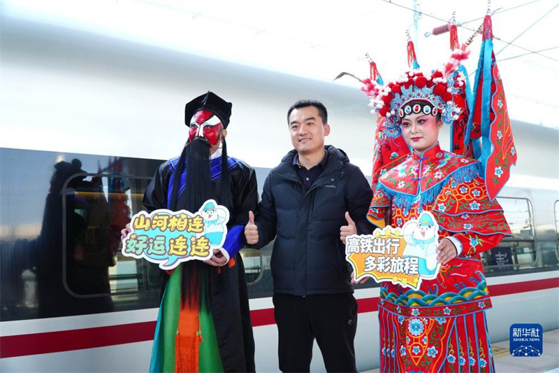 12月8日,在濟(jì)鄭高鐵濟(jì)南長(zhǎng)清站,一名乘客與參加濟(jì)鄭高鐵全線開(kāi)通儀式的戲劇演員一起合影。12月8日,濟(jì)鄭高鐵全線貫通運(yùn)營(yíng)。濟(jì)鄭高鐵是國(guó)家“八縱八橫”高鐵網(wǎng)的重要連接線,是山東省“八縱六橫”高鐵網(wǎng)的西向出省通道,也是河南“米”字形高鐵網(wǎng)的最后一“筆”。項(xiàng)目通車(chē)后,魯豫兩省實(shí)現(xiàn)高鐵直通,鄭州東站至濟(jì)南西站間最快1小時(shí)43分鐘可達(dá)。新華社記者 徐速繪 攝