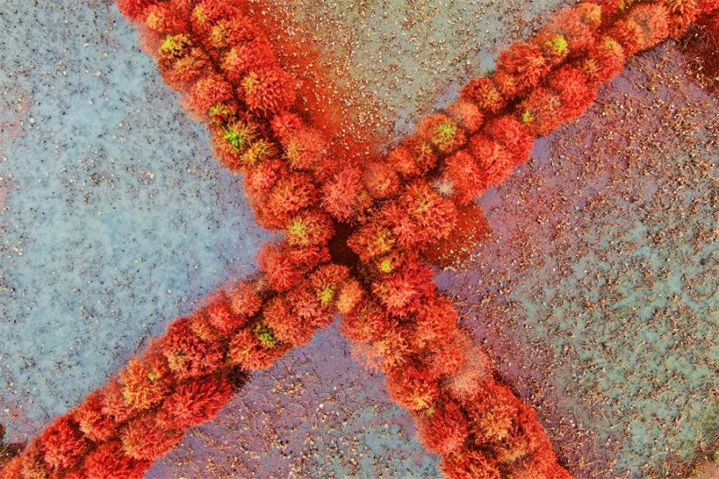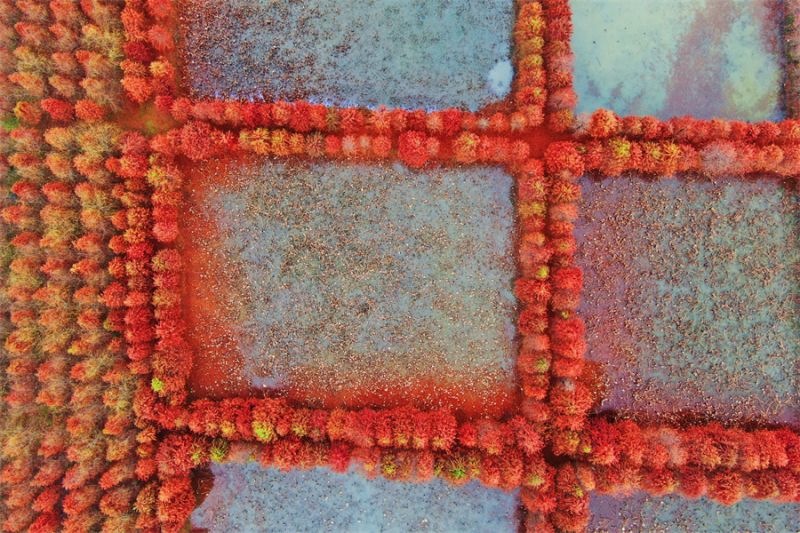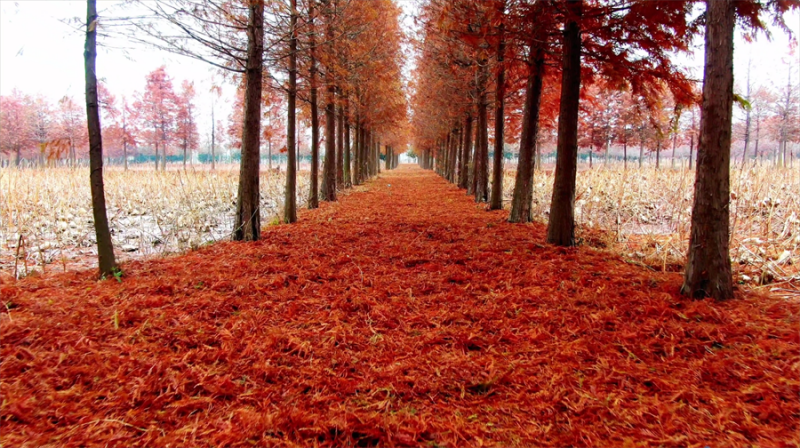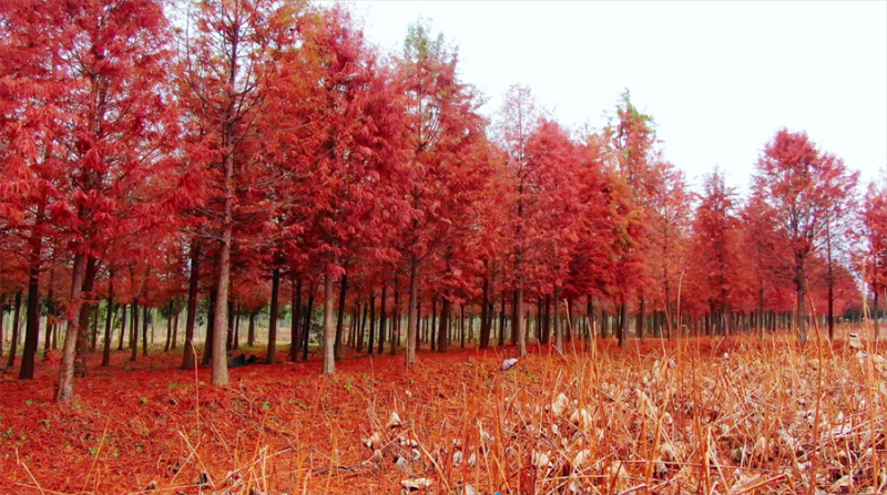 12月13日拍攝的鎮(zhèn)平縣中原荷花博覽園的水杉樹。近日,河南省南陽(yáng)市鎮(zhèn)平縣中原荷花博覽園的水杉樹悄然換上“紅裝”,色彩濃郁,成了冬日一抹別樣的風(fēng)景。(時(shí)君洋 攝)