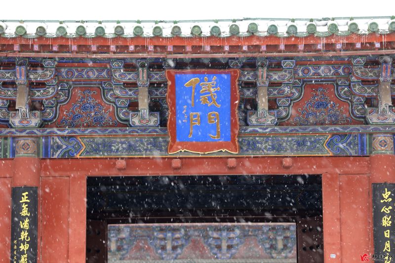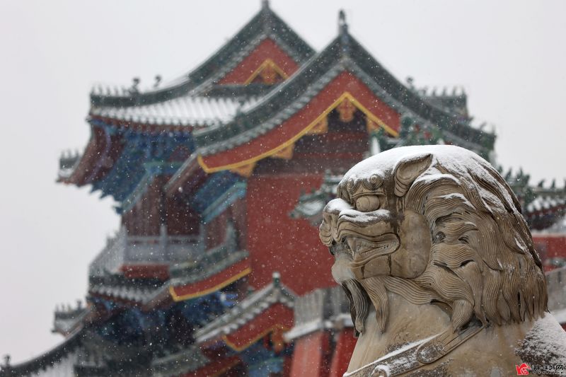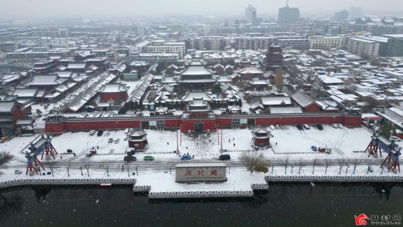 12月15日,開封市再迎降雪。在開封府,“包大人”與游客一起賞雪。開封+記者 袁洋 攝