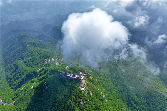 從高空俯瞰,藍(lán)天擁抱著山巒,白云在山頂上飄動(dòng),為桐柏山增添了一種宏偉壯麗的氣勢(shì)。曹靜 攝