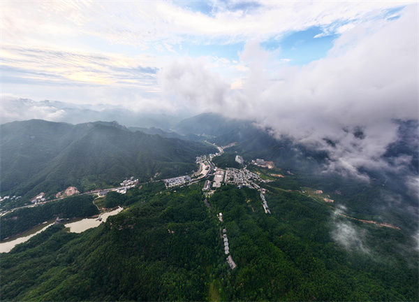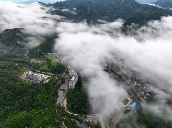 近日,一場夏雨過后,位于汝陽縣的西泰山上空云霧繚繞,景色秀麗,平流霧似輕紗飄動在景區(qū)上空,宛若進(jìn)入一幅綺麗的畫卷。遠(yuǎn)處的青山、靜謐的民宿在縹緲的白霧中平添了幾分詩情畫意。