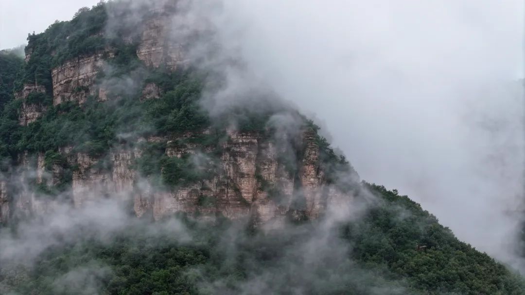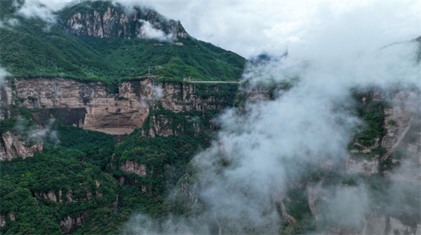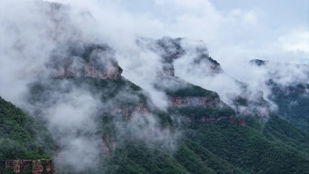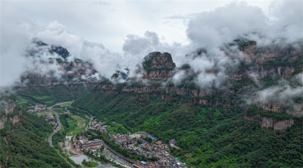 一場夏雨過后,太行大峽谷宛如夢幻之境。山上云海翻騰,山下村莊如畫,道路蜿蜒其間,美不勝收。