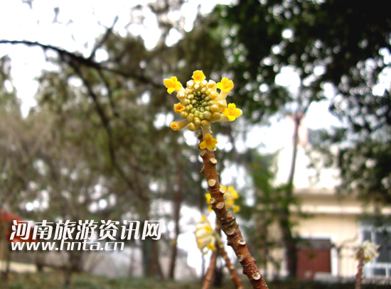 結(jié)香花,又叫打結(jié)花,寓意吉祥。老家在秦嶺等地,它是移居來河南的。結(jié)香一般開在3~4月,果期在9~10月。