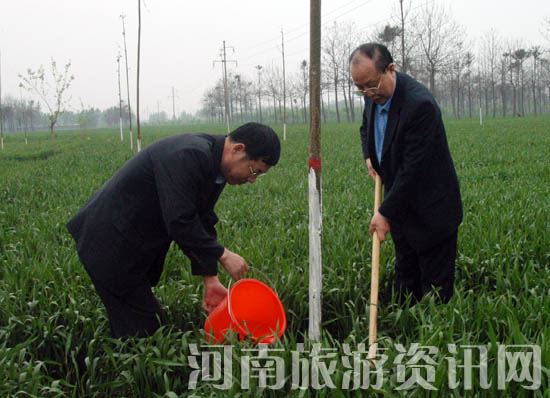 隨后,大家驅(qū)車趕到“焦林”。在蘭考縣城關(guān)鄉(xiāng)朱莊村村南,那棵兩人難以合抱的參天桐樹,就是1963年春焦裕祿栽植的,人們親切地稱它為“焦桐”。在“焦桐”周圍,很多人自發(fā)栽植的梧桐樹形成了方圓百畝的梧桐林,人們又親切地稱之為“焦林”。省旅游局機(jī)關(guān)干部一行懷著無(wú)比崇敬的心情在“焦林”內(nèi)揮鍬澆水,植下泡桐樹,為焦林再添新綠。
