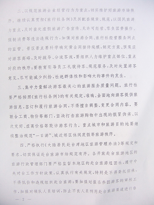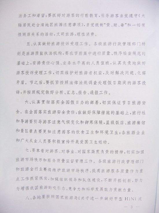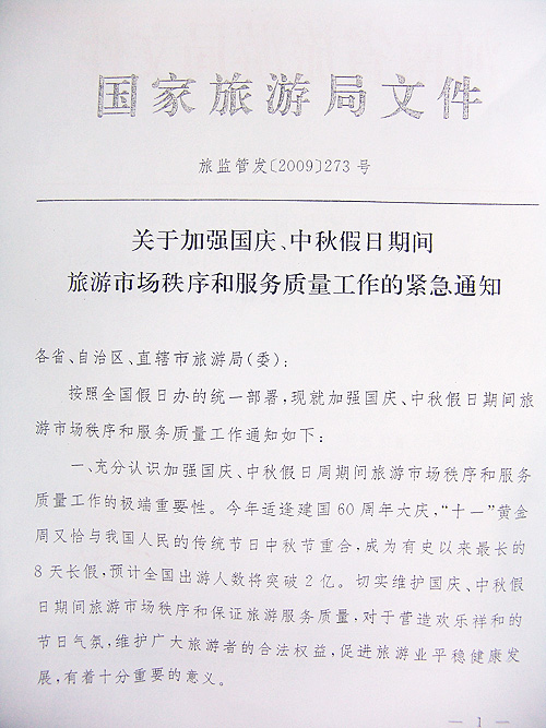 現(xiàn)將國家旅游局《關(guān)于加強(qiáng)國慶、中秋假日期間旅游市場秩序和服務(wù)質(zhì)量工作的緊急通知》(旅監(jiān)管發(fā)[2009]273號)轉(zhuǎn)發(fā)給你們,請按照通知要求,認(rèn)真抓好貫徹落實。各省轄市旅游局在假日期間需組織旅游市場秩序的監(jiān)督檢查,省旅游局將進(jìn)行抽查,切實維護(hù)全省假日期間旅游市場秩序和保證旅游服務(wù)質(zhì)量,促進(jìn)我省旅游業(yè)平穩(wěn)健康發(fā)展。
