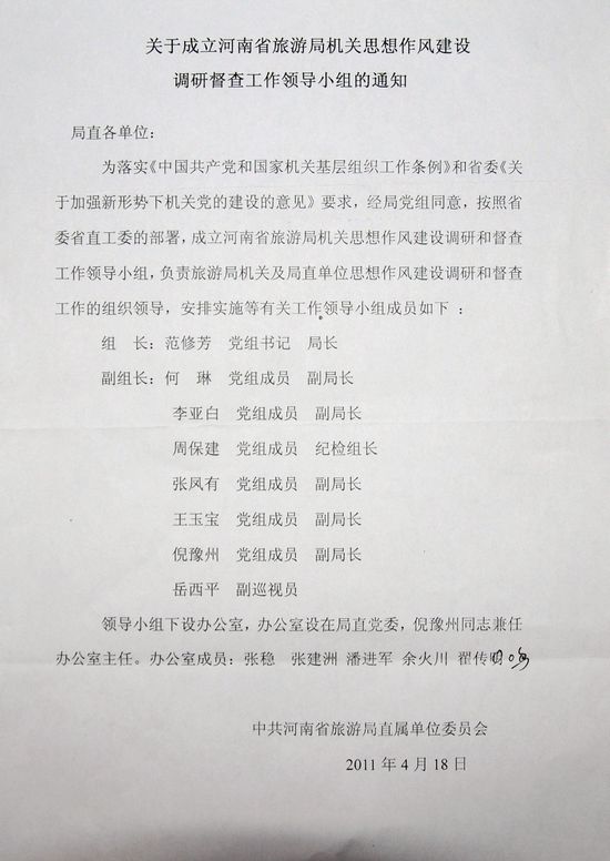 關(guān)于成立河南省旅游局機(jī)關(guān)思想作風(fēng)建設(shè)調(diào)研督查工作領(lǐng)導(dǎo)小組的通知